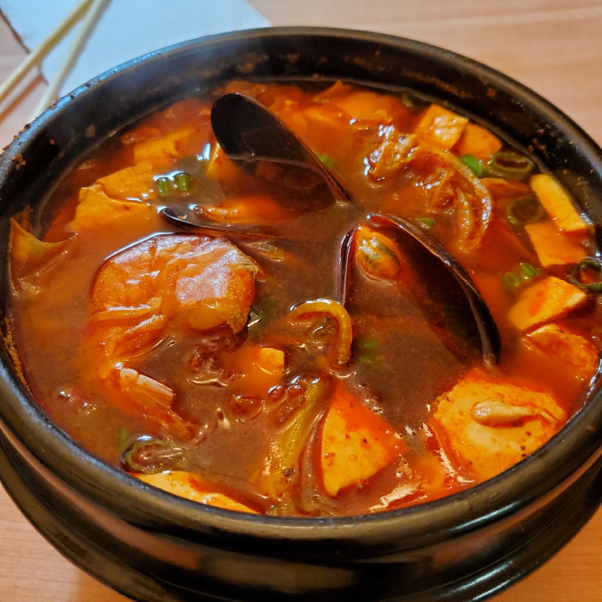 One of my friends really loves this tofu soup spot (and it was close to the ice cream place that my other friend really likes) so our group of five swung by on Saturday afternoon a little after 1pm (managed to find street parking nearby). There were only a few occupied tables when we arrived, so we were seated immediately. It was perfect soup weather, so after looking over their menu, I decided to get their seafood tofu soup with a mild spice level. I noticed a sign with an article mentioning their kimchi pancake, and other reviews also mentioned it, so a friend and I also decided to split one. We didn't have to wait too long for the food to come out, and I liked that everything came out at the same time! As someone with a low tolerance for spice, the mild was personally perfect for me (any spicier and I wouldn't have enjoyed it). I wouldn't say it's the best one I've had, but my craving for tofu soup was satisfied (my friend really liked their mushroom tofu soup so maybe I'll get that next time). The kimchi pancake was definitely an excellent decision -- it was hot and crispy on the outside and soft on the inside with bits of kimchi in the middle. I will be thinking about this kimchi pancake for a long time haha I enjoyed it quite a bit. Note that service fee/gratuity was automatically applied for us since we were a party of five. I don't live in the area, so I don't see myself coming back often, but if you're nearby, I would highly recommend the kimchi pancake!!