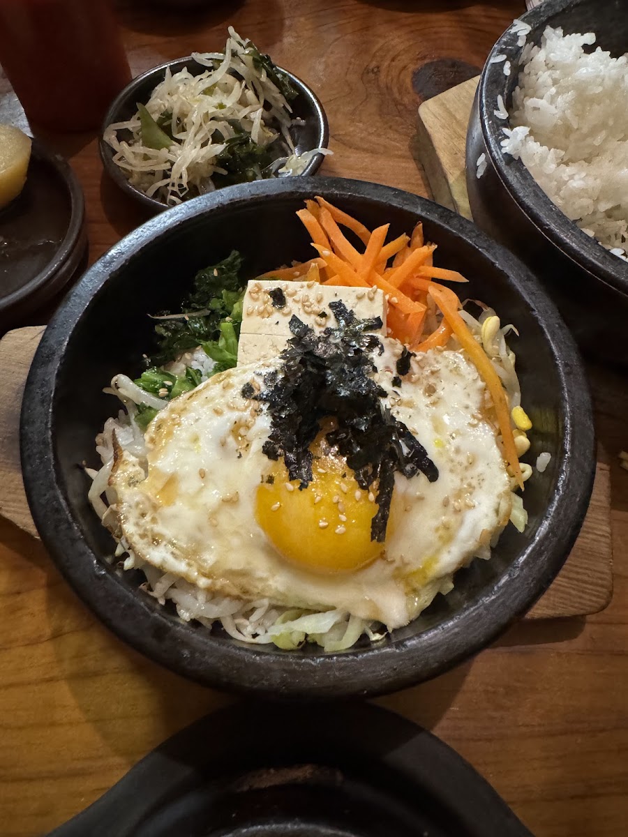I never thought to come in here until a friend said she was craving Korean food. Looking over the menu, how do you decide what to get, there is a lot to choose from. We had a group of 4, 3 of us had never been here so we completely over ordered. To start we ordered: Kimchi pancake Mung bean pancake Chicken wings: regular and soy garlic Soju cocktail I didn't try the mung bean, but the Kimchi pancake was the perfect balance of crispy outside and soft inside. Those that tried the mung bean pancake also loved it. The chicken wings were very big, our favorite was the soy garlic one. It seemed pricey for wings but there were worth it. Not sure what cocktail we got, but it was delicious. For our mains, a friend and I shared the Del Sot Bi Bim Bop, it came with their original tofu soup The Bi Bim Bop was lacking in flavor, I figured for over $20, it would taste good, but it was a bit disappointing, the savior of the meal was the tofu soup, I had never had tofu soup before and this was amazing!!! It was so good I ordered it the next day for delivery. Pro tip: it's way better in the clay pot when you dine in. The service was great and attentive. They made sure our waters were filled and that we had everything we needed.