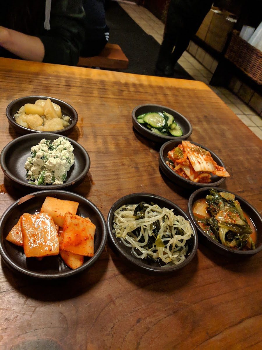 After landing in Oakland, we headed straight to this spot and walked in right when they opened their doors during evening hours at 5pm. We walked into a dining room that can accommodate small to large parties. The Banchan arrived first which included four unlimited sides, which included sprouts, kimchi, pickled spicy cucumbers, and soft potatoes. Our favorite was the cucumbers which paired well with the meal. Starving, we ordered the Soy Sauce and Fresh Garlic Chicken Wings that came with a small side of Daikon. A half order comes with 10 wings. The wings were delicious! They were crispy, meaty, and so flavorful. This was a non spicy dish. We also tried the Kim Chi Bi Bim Bap with Beef. The dish arrived piping hot with a fried egg on top. A comforting rice dish topped with kimchi, carrots. spinach, sprouts, and beef. You'll get to enjoy the crispy rice once you reach the bottom. A side of tofu soup was included and I ordered it mild. The broth was spicy and flavorful, filled with tofu. I saved most of it to take home. Finally, we tried the tofu dumpling soup, which arrived bubbling hot. The Stew contained beef and kimchi dumplings and was totally what we were looking for when picking a dinner spot. Overall, great services and delicious food! The area is filled with many Korean options and we were happy to have found this spot.